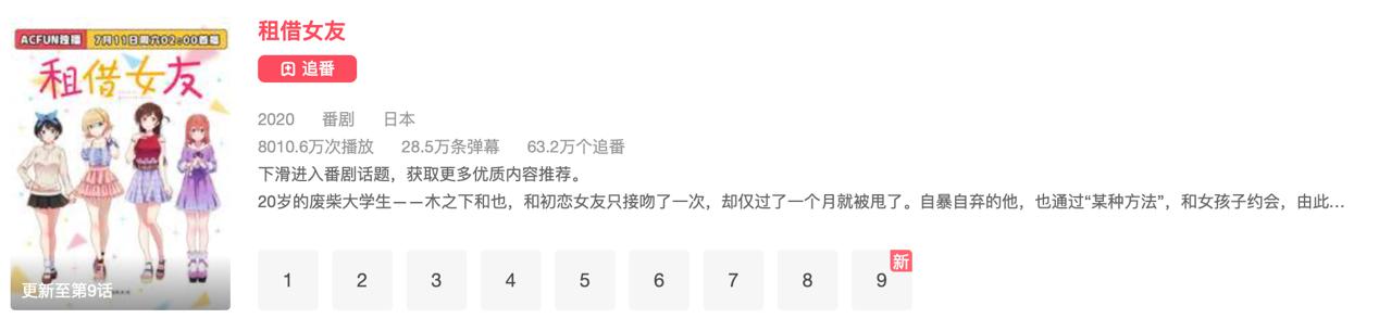 《租借女友》播出都有一段時間了,而人氣是穩坐釣魚台。無論B站在同一時間有多少大作,這番播放量和口碑都雙贏。從目前看來,《租借女友》播放到第九話,播放量超過八千萬。
