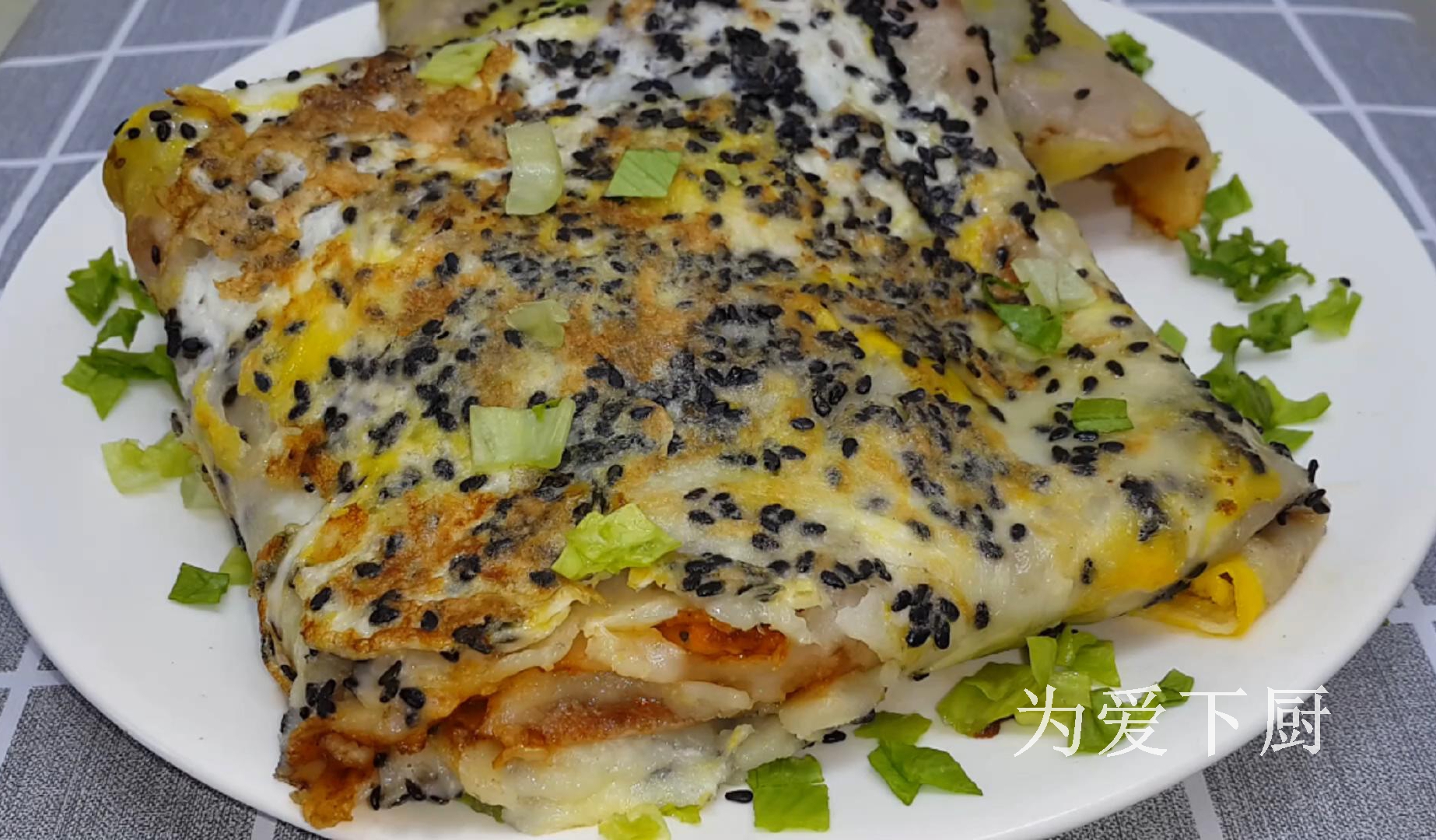 雞蛋扒扒轉圈圈,撒上少許黑芝麻,小蔥碎。