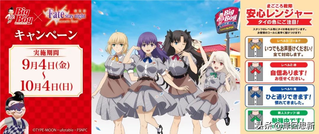 而在聯動方面也有很多,近日,Fate官方就公佈了一項與Big Boy大胃王餐廳聯動,四位女主Saber、間桐櫻、遠坂凜與伊莉雅分別穿上了工作制服,而且這些制服的領帶上其實暗示著不同的員工等級,由高到低,金紅藍綠,大家都見識過在《幻想嘉年華》裡Saber的女僕表現,所以她是當之無愧的金領,當然她不黑化就沒問題,伊莉雅自然就是綠領,屬於新人類型,紅領是自信,藍領是大致可以的感覺,性格上是比較符合遠坂凜與間桐櫻,但是人妻角度來看,間桐櫻應該更勝一籌。