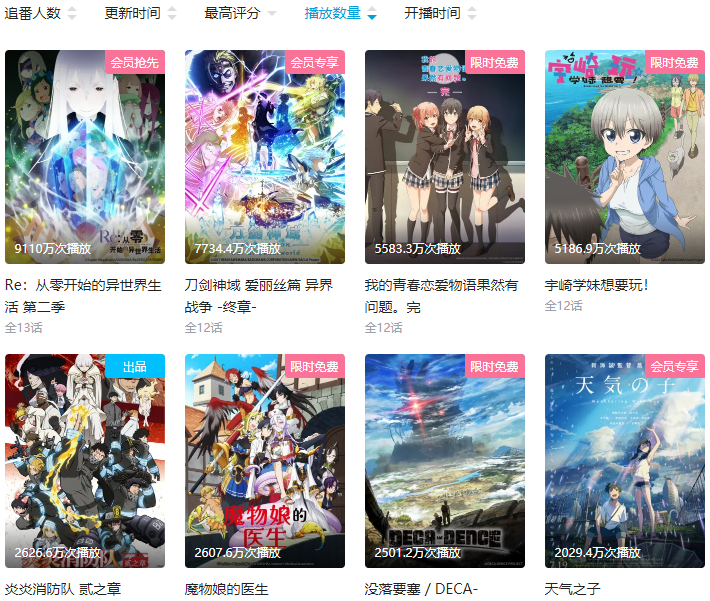B站每個季度都是買番數量最多的網站,同時播放量和討論度也是最高的。而在B站又有著9份及格線,千萬播放基本標準的說法。意思就是說,一部番劇播放量在千萬以上是基本的標準,評分在9分以上只能算是勉強及格。只不過如果我們拿著這兩點標準,去驗證今年的7月番的話,就會發現,符合條件的只有5部。分別是《沒落要塞》、《魔物娘的醫生》、《炎炎消防隊》、《宇崎學妹想要玩!》以及《Re0第二季》。