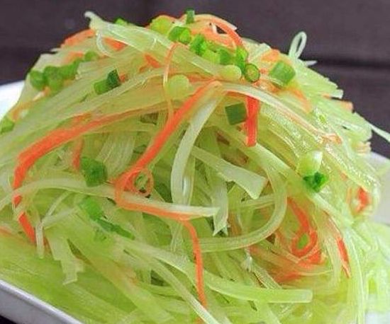 1.白蘿蔔洗淨去皮,切成5厘米左右的一段,然後切成0.5厘米厚的薄片,改刀成絲。